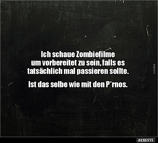 Ich schaue Zombiefilme um vorbereitet zu sein, falls es tatsächlich mal passieren sollte. Ist das selbe wie mit den P*rnos.