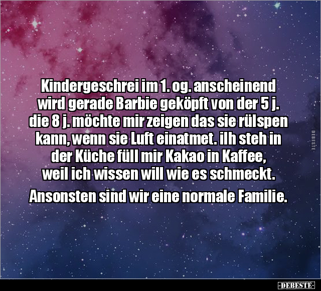Kindergeschrei im 1. og. anscheinend wird gerade Barbie geköpft von der 5 j. die 8 j. möchte mir zeigen das sie rülspen kann, wenn sie Luft einatmet. iIh steh in der Küche füll mir Kakao in Kaffee, weil ich wissen will wie es schmeckt. Ansonsten sind wir eine normale Familie.