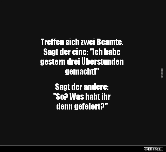 Treffen sich zwei Beamte. Sagt der eine: "Ich habe gestern drei Überstunden gemacht!" Sagt der andere: "So? Was habt ihr denn gefeiert?"