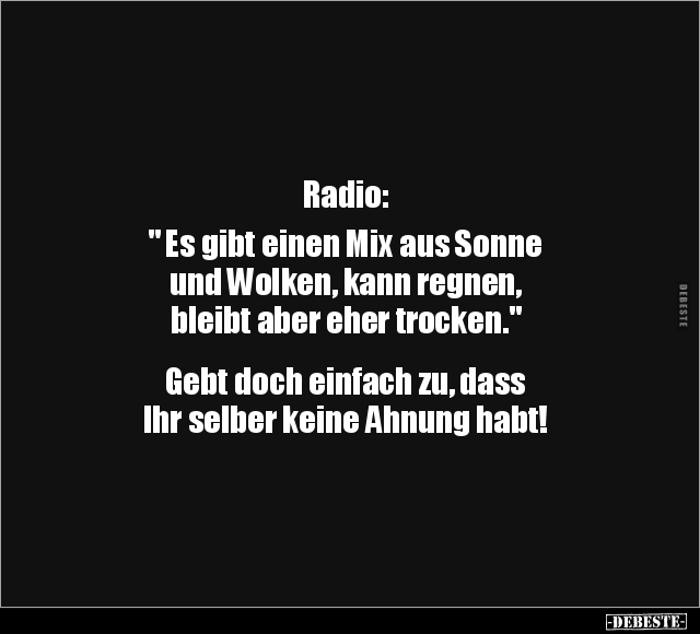 Radio: " Es gibt einen Mix aus Sonne und Wolken, kann regnen, bleibt aber eher trocken." Gebt doch einfach zu, dass Ihr selber keine Ahnung habt!