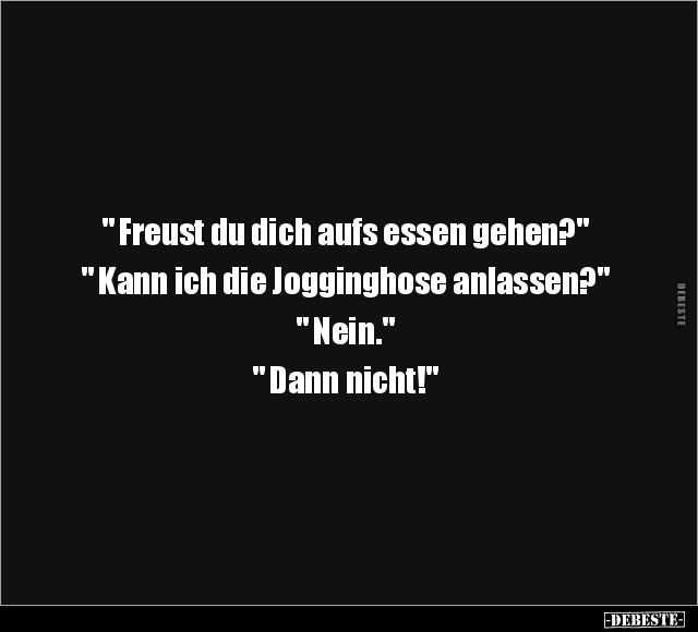 " Freust du dich aufs essen gehen?" " Kann ich die Jogginghose anlassen?" " Nein." " Dann nicht!"
