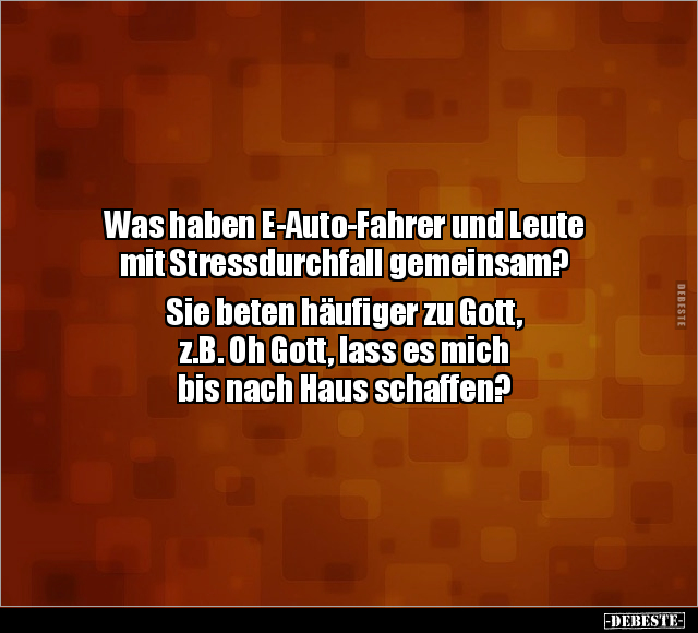 Was haben E-Auto-Fahrer und Leute mit Stressdurchfall gemeinsam? Sie beten häufiger zu Gott, z.B. Oh Gott, lass es mich bis nach Haus schaffen?