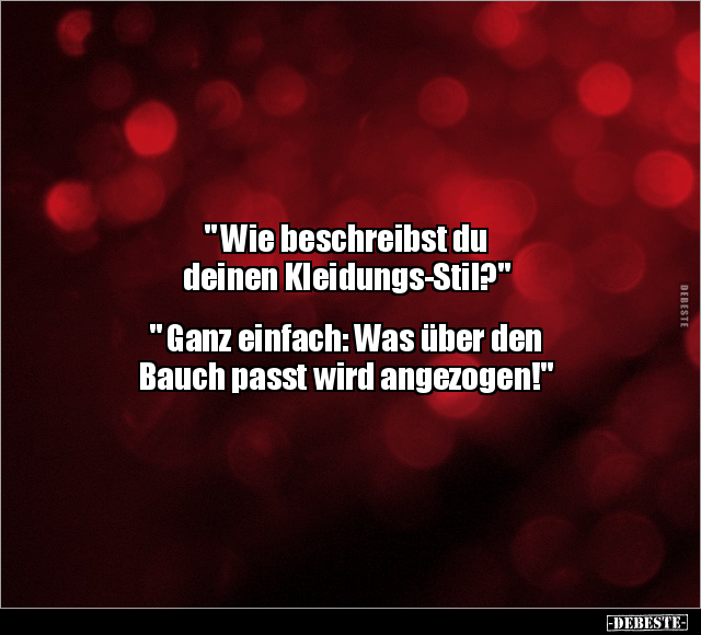 " Wie beschreibst du deinen Kleidungs-Stil?" " Ganz einfach: Was über den Bauch passt wird angezogen!"