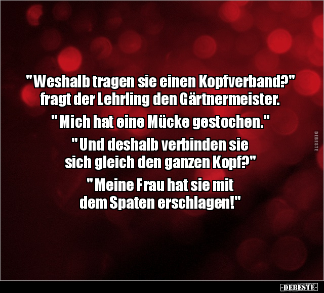 " Weshalb tragen sie einen Kopfverband?" fragt der Lehrling den Gärtnermeister. " Mich hat eine Mücke gestochen." " Und deshalb verbinden sie sich gleich den ganzen Kopf?" " Meine Frau hat sie mit dem Spaten erschlagen!"