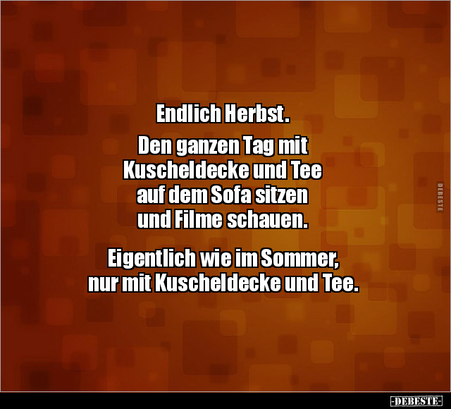 Endlich Herbst. Den ganzen Tag mit Kuscheldecke und Tee auf dem Sofa sitzen und Filme schauen. Eigentlich wie im Sommer, nur mit Kuscheldecke und Tee.