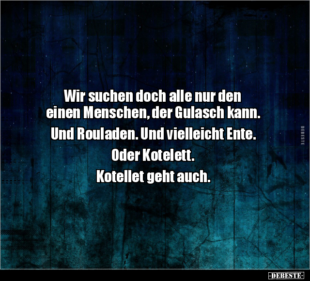 Wir suchen doch alle nur den einen Menschen, der Gulasch kann. Und Rouladen. Und vielleicht Ente. Oder Kotelett. Kotellet geht auch.