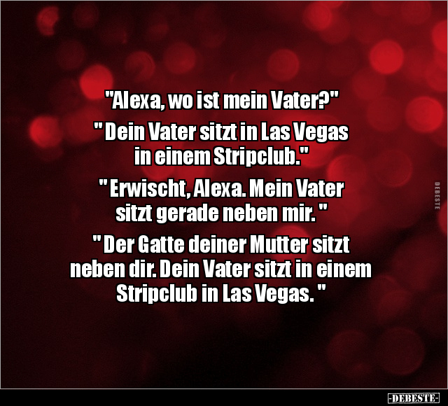 "Alexa, wo ist mein Vater?" " Dein Vater sitzt in Las Vegas in einem Stripclub." " Erwischt, Alexa. Mein Vater sitzt gerade neben mir. " " Der Gatte deiner Mutter sitzt neben dir. Dein Vater sitzt in einem Stripclub in Las Vegas. "