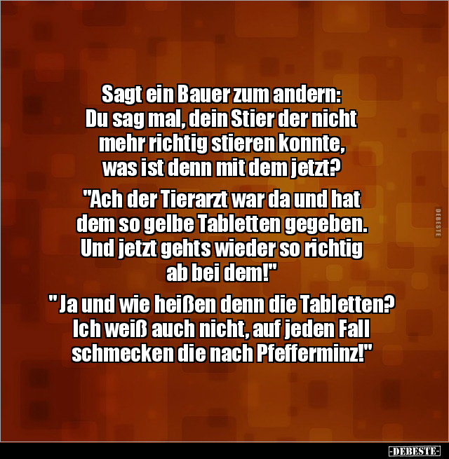 Sagt ein Bauer zum andern: Du sag mal, dein Stier der nicht mehr richtig stieren konnte, was ist denn mit dem jetzt? "Ach der Tierarzt war da und hat dem so gelbe Tabletten gegeben. Und jetzt gehts wieder so richtig ab bei dem!" " Ja und wie heißen denn die Tabletten? Ich weiß auch nicht, auf jeden Fall schmecken die nach Pfefferminz!"