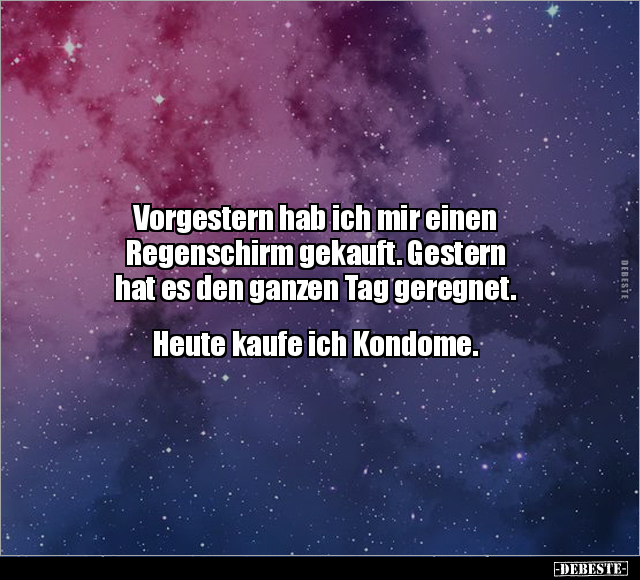 Vorgestern hab ich mir einen Regenschirm gekauft. Gestern hat es den ganzen Tag geregnet. Heute kaufe ich Kondome.