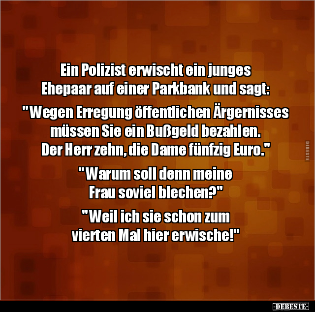 Ein Polizist erwischt ein junges Ehepaar auf einer Parkbank und sagt: " Wegen Erregung öffentlichen Ärgernisses müssen Sie ein Bußgeld bezahlen. Der Herr zehn, die Dame fünfzig Euro." " Warum soll denn meine Frau soviel blechen?" " Weil ich sie schon zum vierten Mal hier erwische!"
