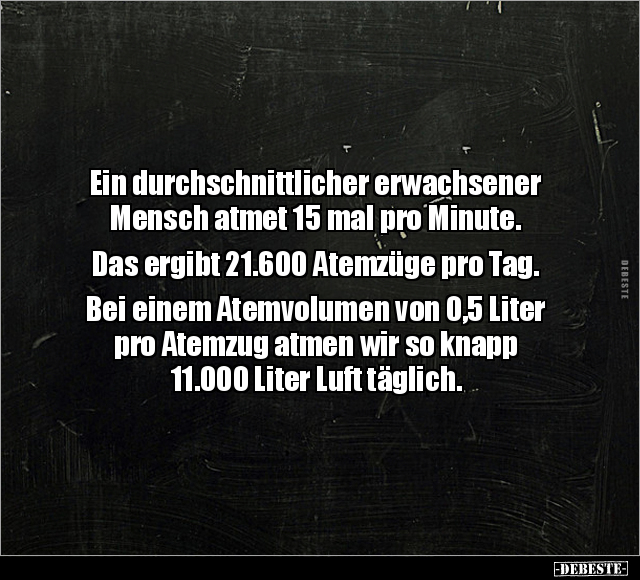 Ein durchschnittlicher erwachsener Mensch atmet 15 mal pro Minute. Das ergibt 21.600 Atemzüge pro Tag. Bei einem Atemvolumen von 0,5 Liter pro Atemzug atmen wir so knapp 11.000 Liter Luft täglich.