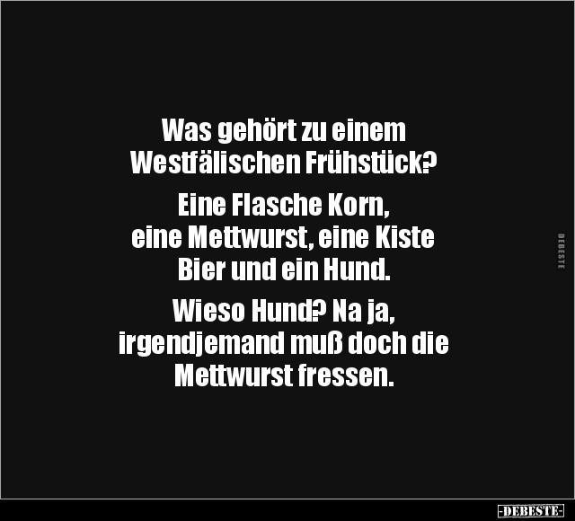 Was gehört zu einem Westfälischen Frühstück? Eine Flasche Korn, eine Mettwurst, eine Kiste Bier und ein Hund. Wieso Hund? Na ja, irgendjemand muß doch die Mettwurst fressen.