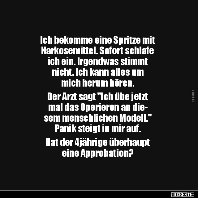 Ich bekomme eine Spritze mit Narkosemittel. Sofort schlafe ich ein. Irgendwas stimmt nicht. Ich kann alles um mich herum hören. Der Arzt sagt "Ich übe jetzt mal das Operieren an die- sem menschlichen Modell." Panik steigt in mir auf. Hat der 4jährige überhaupt eine Approbation?