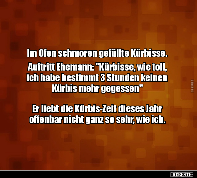 Im Ofen schmoren gefüllte Kürbisse. Auftritt Ehemann: "Kürbisse, wie toll, ich habe bestimmt 3 Stunden keinen Kürbis mehr gegessen" Er liebt die Kürbis-Zeit dieses Jahr offenbar nicht ganz so sehr, wie ich.