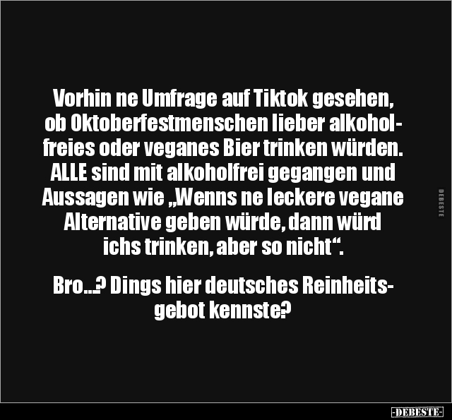 Vorhin ne Umfrage auf Tiktok gesehen, ob Oktoberfestmenschen lieber alkohol- freies oder veganes Bier trinken würden. ALLE sind mit alkoholfrei gegangen und Aussagen wie „Wenns ne leckere vegane Alternative geben würde, dann würd ichs trinken, aber so nicht“. Bro…? Dings hier deutsches Reinheits- gebot kennste?