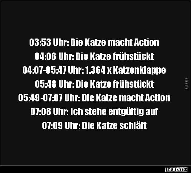 03:53 Uhr: Die Katze macht Action 04:06 Uhr: Die Katze frühstückt 04:07-05:47 Uhr: 1.364 x Katzenklappe 05:48 Uhr: Die Katze frühstückt 05:49-07:07 Uhr: Die Katze macht Action 07:08 Uhr: Ich stehe entgültig auf 07:09 Uhr: Die Katze schläft