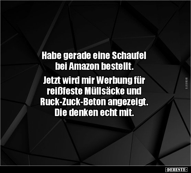 Habe gerade eine Schaufel bei Amazon bestellt. Jetzt wird mir Werbung für reißfeste Müllsäcke und Ruck-Zuck-Beton angezeigt. Die denken echt mit.