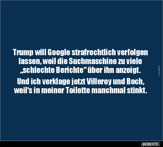 Trump will Google strafrechtlich verfolgen lassen, weil die Suchmaschine zu viele „schlechte Berichte“ über ihn anzeigt. Und ich verklage jetzt Villeroy und Boch, weil‘s in meiner Toilette manchmal stinkt.