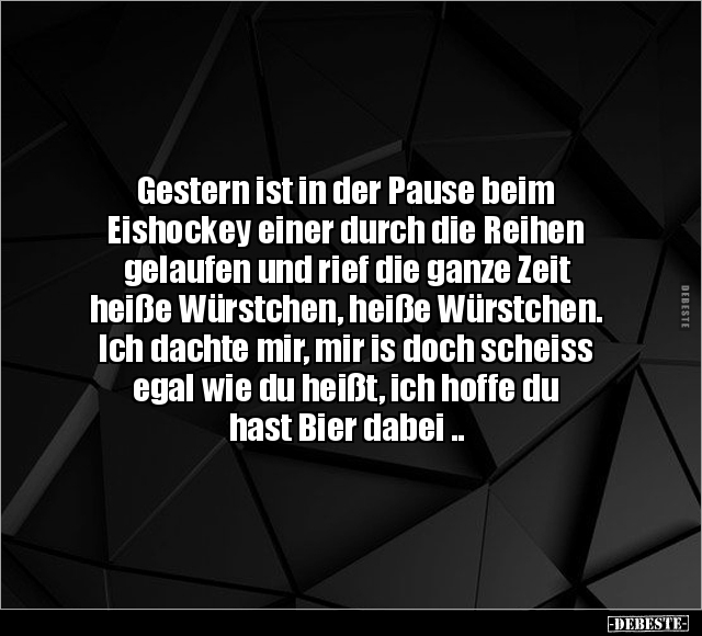 Gestern ist in der Pause beim Eishockey einer durch die Reihen gelaufen und rief die ganze Zeit heiße Würstchen, heiße Würstchen. Ich dachte mir, mir is doch scheiss egal wie du heißt, ich hoffe du hast Bier dabei ..