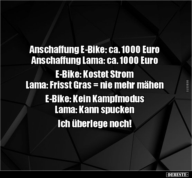 Anschaffung E-Bike: ca. 1000 Euro Anschaffung Lama: ca. 1000 Euro E-Bike: Kostet Strom Lama: Frisst Gras = nie mehr mähen E-Bike: Kein Kampfmodus Lama: Kann spucken Ich überlege noch!