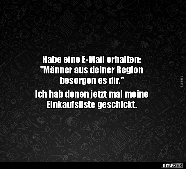 Habe eine E-Mail erhalten: "Männer aus deiner Region besorgen es dir." Ich hab denen jetzt mal meine Einkaufsliste geschickt.