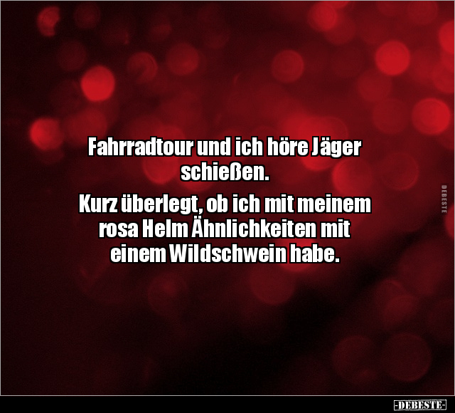Fahrradtour und ich höre Jäger schießen. Kurz überlegt, ob ich mit meinem rosa Helm Ähnlichkeiten mit einem Wildschwein habe.