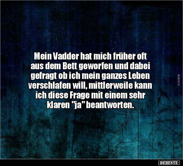 Mein Vadder hat mich früher oft aus dem Bett geworfen und dabei gefragt ob ich mein ganzes Leben verschlafen will, mittlerweile kann ich diese Frage mit einem sehr klaren "ja" beantworten.