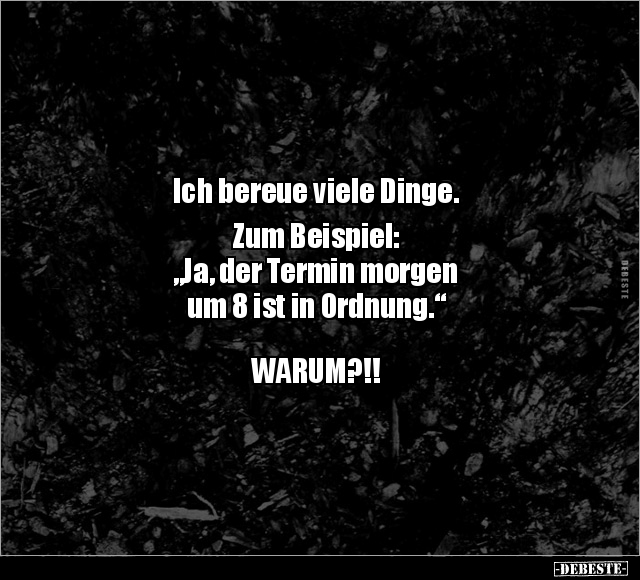 Ich bereue viele Dinge. Zum Beispiel: „Ja, der Termin morgen um 8 ist in Ordnung.“ WARUM?!!