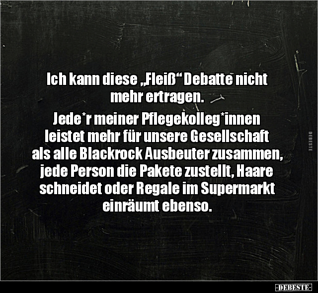 Ich kann diese „Fleiß“ Debatte nicht mehr ertragen. Jede*r meiner Pflegekolleg*innen leistet mehr für unsere Gesellschaft als alle Blackrock Ausbeuter zusammen, jede Person die Pakete zustellt, Haare schneidet oder Regale im Supermarkt einräumt ebenso.