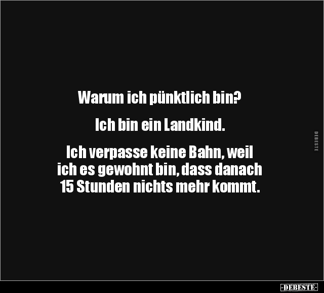 Warum ich pünktlich bin? Ich bin ein Landkind. Ich verpasse keine Bahn, weil ich es gewohnt bin, dass danach 15 Stunden nichts mehr kommt.