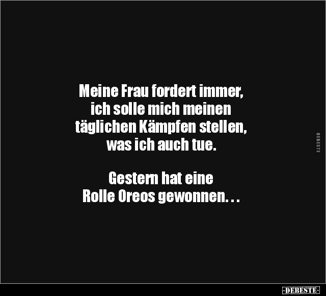 Meine Frau fordert immer, ich solle mich meinen täglichen Kämpfen stellen, was ich auch tue. Gestern hat eine Rolle Oreos gewonnen. . .