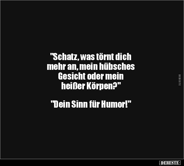 "Schatz, was törnt dich mehr an, mein hübsches Gesicht oder mein heißer Körpen?" "Dein Sinn für Humor!"