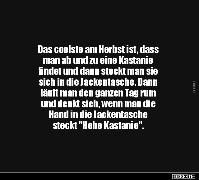 Das coolste am Herbst ist, dass man ab und zu eine Kastanie findet und dann steckt man sie sich in die Jackentasche. Dann läuft man den ganzen Tag rum und denkt sich, wenn man die Hand in die Jackentasche steckt "Hehe Kastanie".