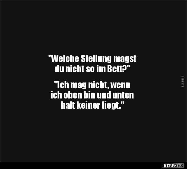 "Welche Stellung magst du nicht so im Bett?" "Ich mag nicht, wenn ich oben bin und unten halt keiner liegt."