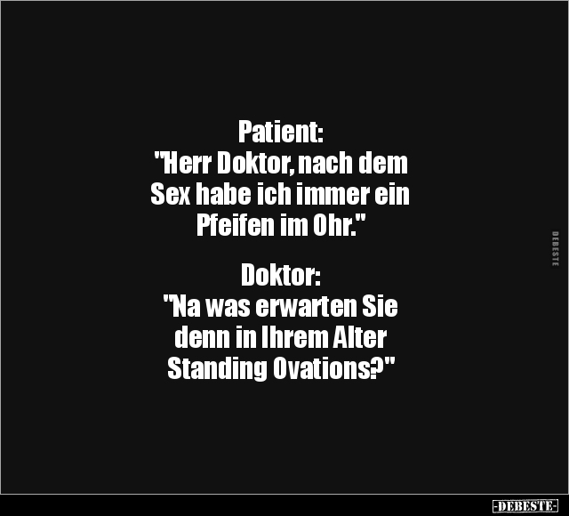 Patient: "Herr Doktor, nach dem Sex habe ich immer ein Pfeifen im Ohr." Doktor: "Na was erwarten Sie denn in Ihrem Alter Standing Ovations?"