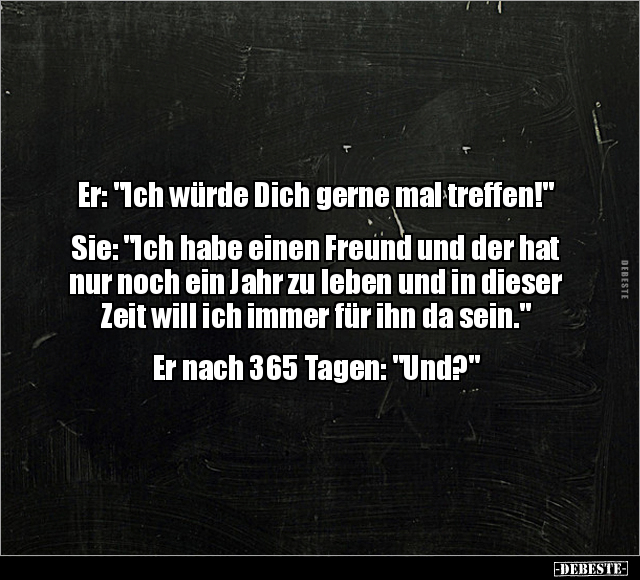 Er: "Ich würde Dich gerne mal treffen!" Sie: "Ich habe einen Freund und der hat nur noch ein Jahr zu leben und in dieser Zeit will ich immer für ihn da sein." Er nach 365 Tagen: "Und?"
