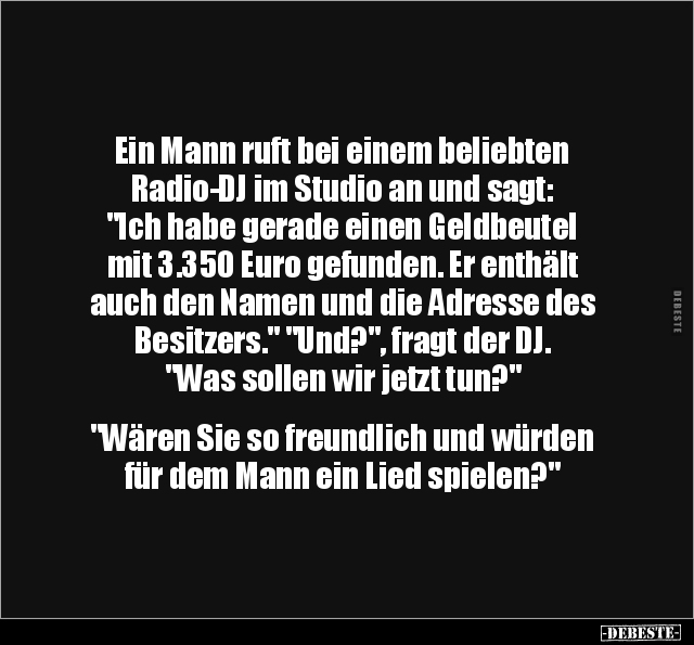 Ein Mann ruft bei einem beliebten Radio-DJ im Studio an und sagt: "Ich habe gerade einen Geldbeutel mit 3.350 Euro gefunden. Er enthält auch den Namen und die Adresse des Besitzers." "Und?", fragt der DJ. "Was sollen wir jetzt tun?" "Wären Sie so freundlich und würden für dem Mann ein Lied spielen?"