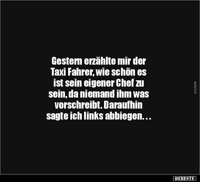 Gestern erzählte mir der Taxi Fahrer, wie schön es ist sein eigener Chef zu sein, da niemand ihm was vorschreibt. Daraufhin sagte ich links abbiegen. . .
