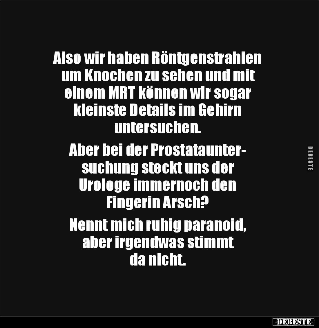 Also wir haben Röntgenstrahlen um Knochen zu sehen und mit einem MRT können wir sogar kleinste Details im Gehirn untersuchen. Aber bei der Prostataunter- suchung steckt uns der Urologe immernoch den Fingerin Arsch? Nennt mich ruhig paranoid, aber irgendwas stimmt da nicht.