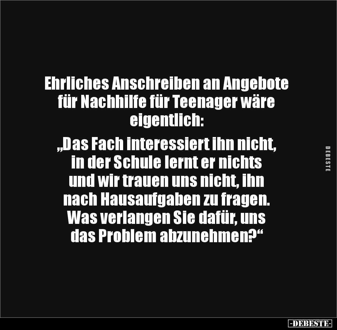 Ehrliches Anschreiben an Angebote für Nachhilfe für Teenager wäre eigentlich: „Das Fach interessiert ihn nicht, in der Schule lernt er nichts und wir trauen uns nicht, ihn nach Hausaufgaben zu fragen. Was verlangen Sie dafür, uns das Problem abzunehmen?“