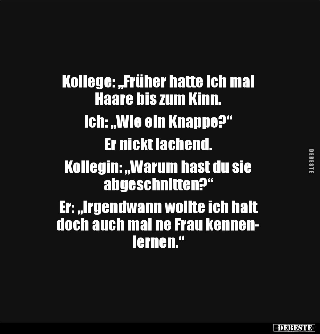 Kollege: „Früher hatte ich mal Haare bis zum Kinn. Ich: „Wie ein Knappe?“ Er nickt lachend. Kollegin: „Warum hast du sie abgeschnitten?“ Er: „Irgendwann wollte ich halt doch auch mal ne Frau kennen- lernen.“