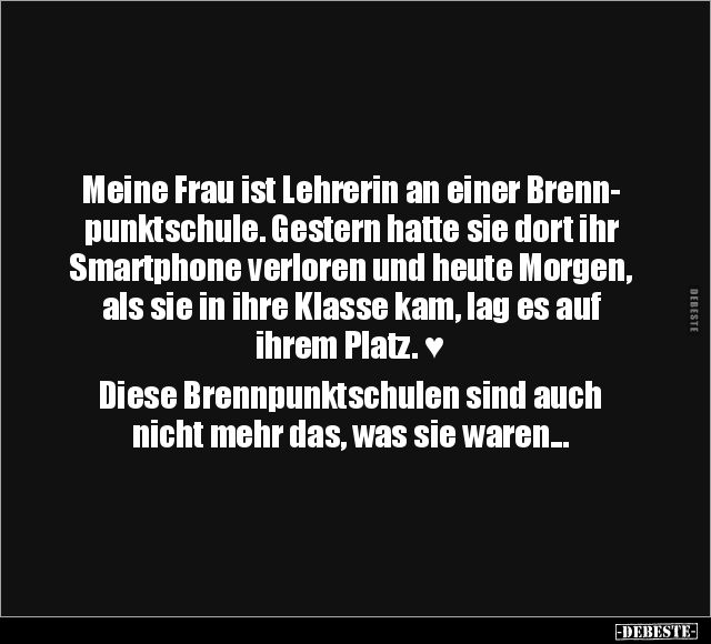Meine Frau ist Lehrerin an einer Brenn- punktschule. Gestern hatte sie dort ihr Smartphone verloren und heute Morgen, als sie in ihre Klasse kam, lag es auf ihrem Platz. ♥ Diese Brennpunktschulen sind auch nicht mehr das, was sie waren...