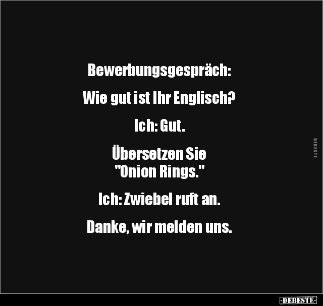 Bewerbungsgespräch: Wie gut ist Ihr Englisch? Ich: Gut. Übersetzen Sie "Onion Rings." Ich: Zwiebel ruft an. Danke, wir melden uns.