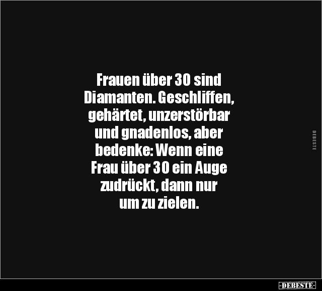 Frauen über 30 sind Diamanten. Geschliffen, gehärtet, unzerstörbar und gnadenlos, aber bedenke: Wenn eine Frau über 30 ein Auge zudrückt, dann nur um zu zielen.