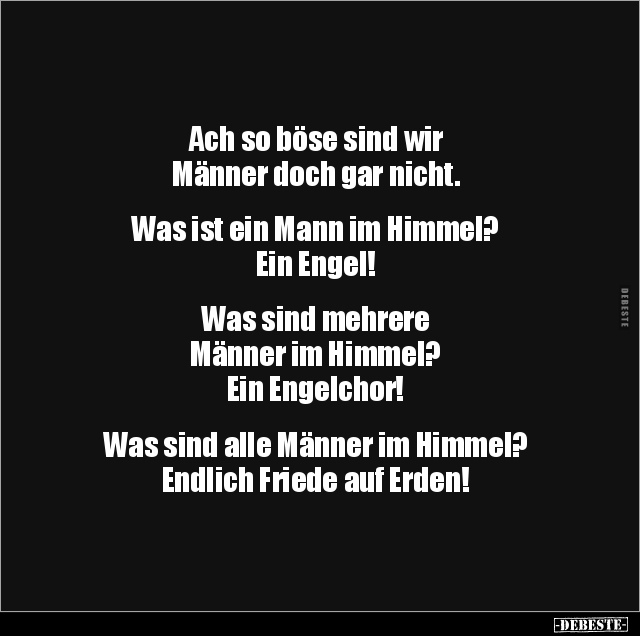 Ach so böse sind wir Männer doch gar nicht. Was ist ein Mann im Himmel? Ein Engel! Was sind mehrere Männer im Himmel? Ein Engelchor! Was sind alle Männer im Himmel? Endlich Friede auf Erden!