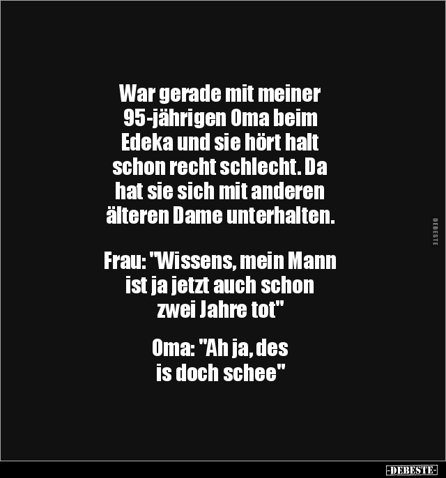 War gerade mit meiner 95-jährigen Oma beim Edeka und sie hört halt schon recht schlecht. Da hat sie sich mit anderen älteren Dame unterhalten. Frau: "Wissens, mein Mann ist ja jetzt auch schon zwei Jahre tot" Oma: "Ah ja, des is doch schee"