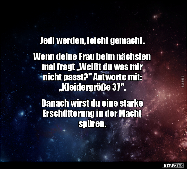 Jedi werden, leicht gemacht. Wenn deine Frau beim nächsten mal fragt „Weißt du was mir nicht passt?" Antworte mit: „Kleidergröße 37". Danach wirst du eine starke Erschütterung in der Macht spüren.