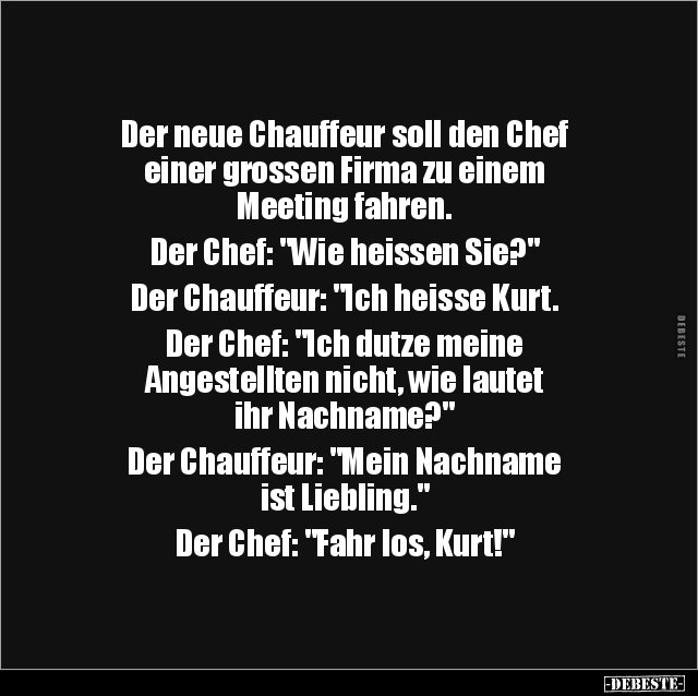 Der neue Chauffeur soll den Chef einer grossen Firma zu einem Meeting fahren. Der Chef: "Wie heissen Sie?" Der Chauffeur: "Ich heisse Kurt. Der Chef: "Ich dutze meine Angestellten nicht, wie lautet ihr Nachname?" Der Chauffeur: "Mein Nachname ist Liebling." Der Chef: "Fahr los, Kurt!"