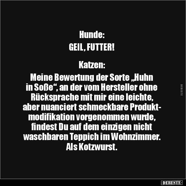 Hunde: GEIL, FUTTER! Katzen: Meine Bewertung der Sorte „Huhn in Soße“, an der vom Hersteller ohne Rücksprache mit mir eine leichte, aber nuanciert schmeckbare Produkt- modifikation vorgenommen wurde, findest Du auf dem einzigen nicht waschbaren Teppich im Wohnzimmer. Als Kotzwurst.