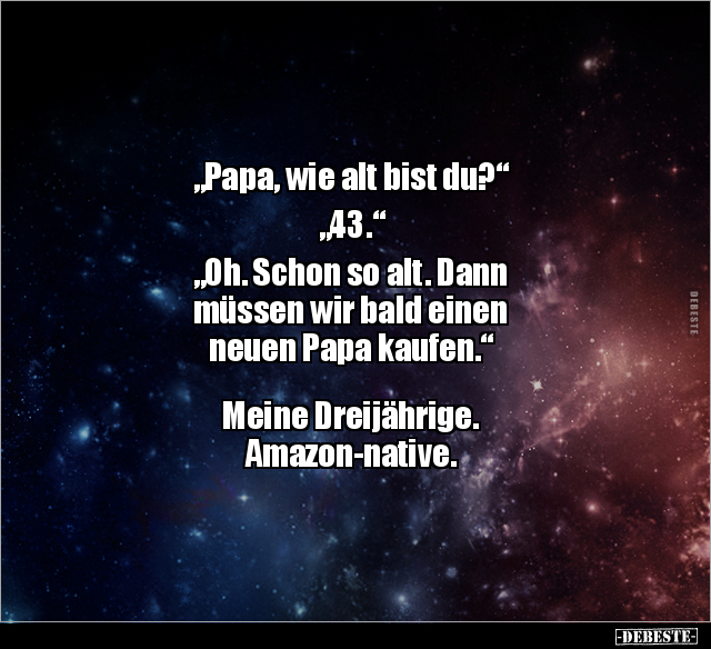 „Papa, wie alt bist du?“ „43.“ „Oh. Schon so alt. Dann müssen wir bald einen neuen Papa kaufen.“ Meine Dreijährige. Amazon-native.